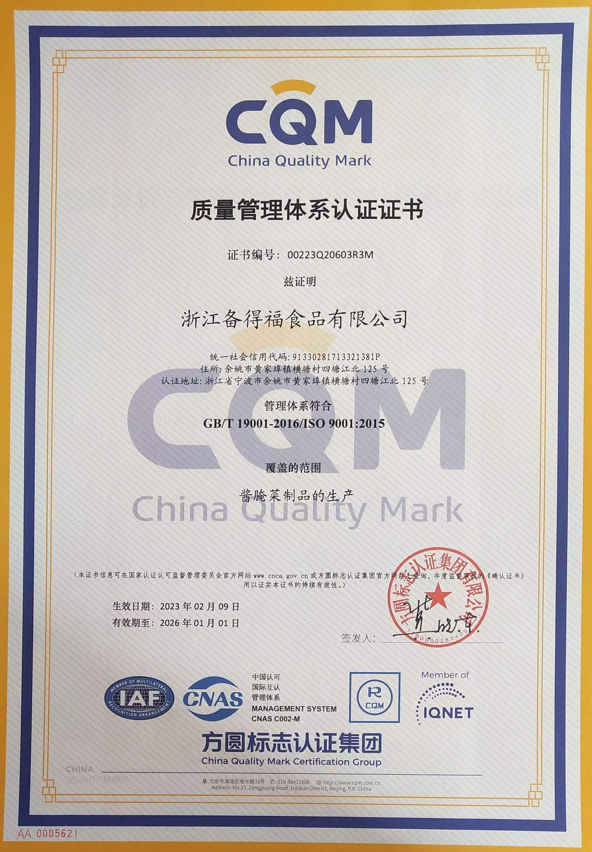 質量管理體系認證證書